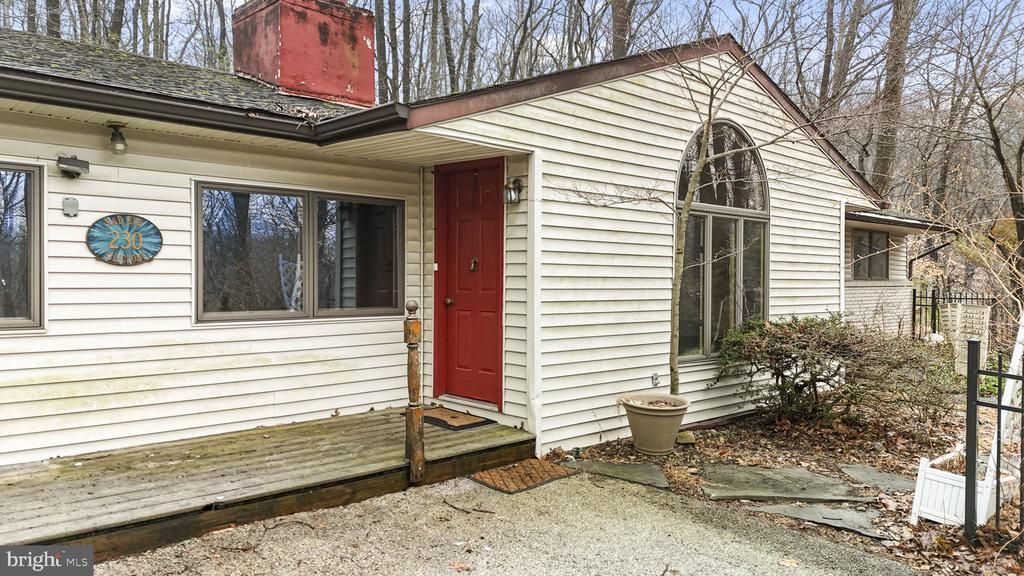Welcome to 230 Jug Hollow Road! Nestled in a peaceful, wooded setting, this spacious 4-bedroom, 2.5-bath ranch offers a fantastic opportunity to create your dream home. The flexible floor plan features a large living room with hardwood floors, a fireplace with wood burning stove insert, handcrafted built in bookcase, skylight, and a bright foyer highlighted by a dramatic arched window. There is an additional family room, also with fireplace, a cedar lined closet, and a secret closet with access to the attic. The kitchen and dining area provide plenty of space to redesign and customize to your taste. The bedroom wing includes a master suite with a private powder room and access to a shared bathroom. There are three additional bedrooms, one of which has private access to the shared bathroom, and a full hall bath. Additional features include a dedicated laundry room, pantry space, arts and crafts room or studio with skylight, and a large unfinished basement offering abundant storage and potential. Outside, enjoy the private, 2.4 acre wooded lot! In front of the house is a slated patio for enjoying the woods and the garden, planted by the owner. In spring this area is covered with gorgeous azalea, mountain laurel, wisteria, and rhododendron blooms. The highlight of the front garden is the beautiful blooming magnolia tree. Near the front door is a Japanese Maple tree. Rhododendron bushes also grace the back of the house, visible through the French doors in the dining room. The side of the house has a second patio area, and a one room play house, wired for electricity, built by the owner’s father. Wildlife visitors are frequent, from deer, squirrels, and chipmunks, to many varieties of birds which change with the seasons. The owners and builders of the house were artists with a unique vision and an appreciation for the beauty and serenity of their homes' location. 230 Jug Hollow was one of the very first homes built in this now very desirable area. With great bones, generous room sizes, and endless renovation potential, this home is ready for your vision and updates to make it truly your own.